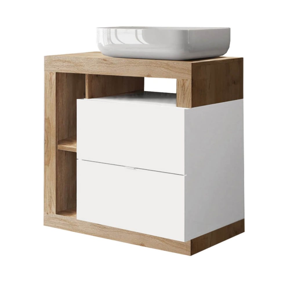 Meuble vasque 78cm 2 tiroirs blanc laqué et aspect bois finition cadi