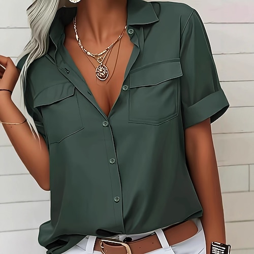 Per donna Camicia Estiva Camicia elegante Blusa Tasca Bottoni Elegante Vintage Manica Corta Collo ripiegato Top Regolari Quotidiano Lavoro Verde Estate Primavera