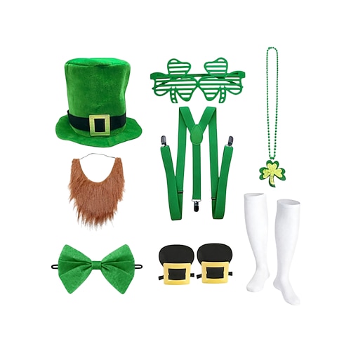 set di costumi da folletto per il giorno di San Patrizio da uomo, composto da 8 pezzi: cappello verde, barba, bretelle, papillon, guanti, collana accessori per le celebrazioni festive