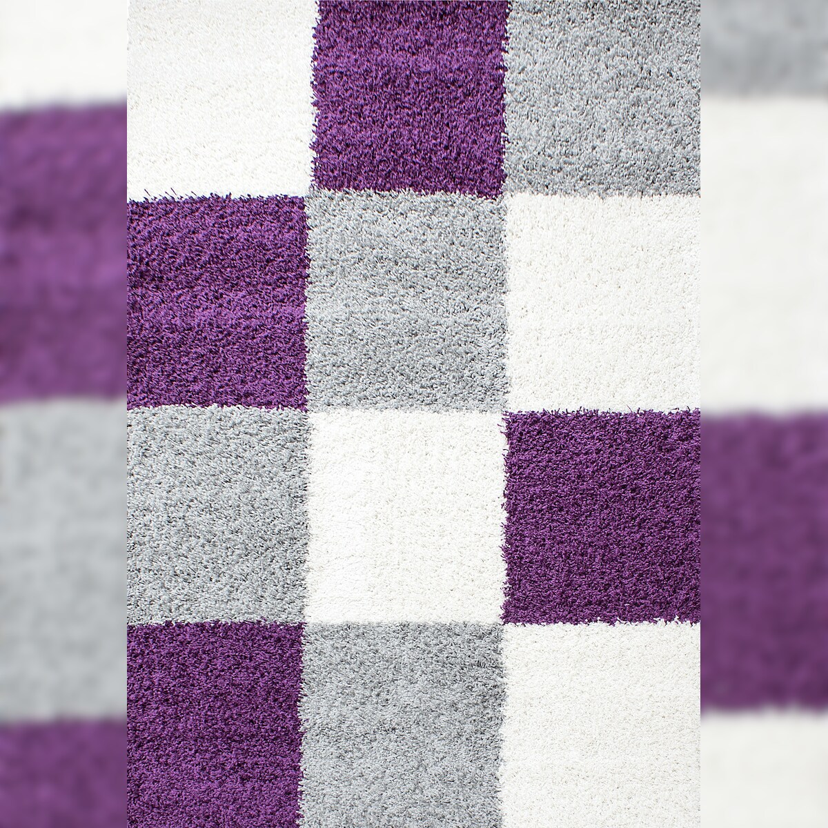 Teppich Hochflor Karo Polypropylen Wohnzimmer Shaggy Violett Läufer 80x150 | Kadima Design
