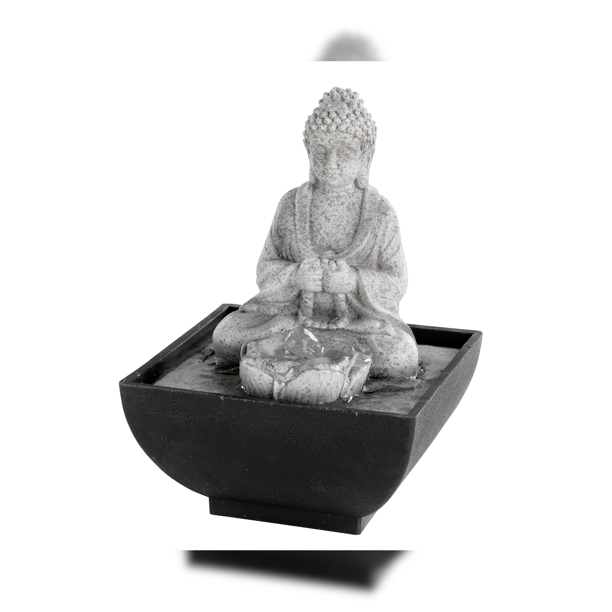 Lumineo Buddha Brunnen mit LED Beleuchtung 13x18cm Keramik Zimmerbrunnen Tischbrunnen Wasserbrunnen Dekoration Wohnzimmer Balkon Terrasse Grau Schwarz