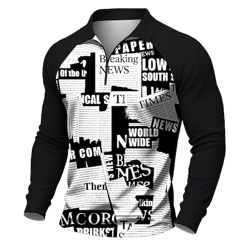 Per uomo Giornale Polo Manica Lunga Magliette polo Casual All'aperto Streetwear Abbigliamento quotidiano Stampa 3D Polo con cerniera a un quarto Primavera Autunno Inverno Nero Bianco