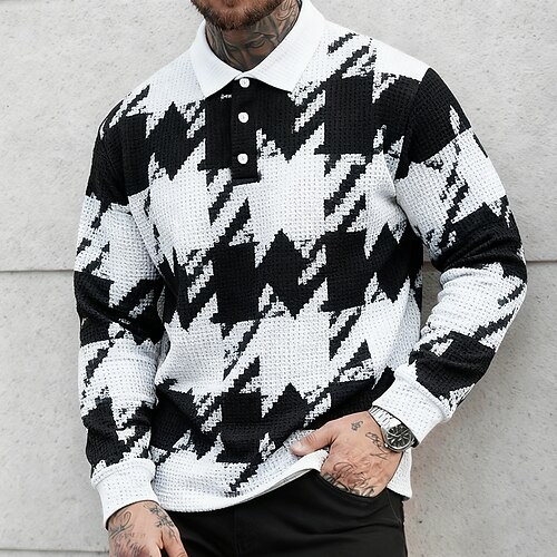 Per uomo Polo a maglia intrecciata Polo da Golf Manica Lunga Magliette polo Collo ripiegato Vintage Casual Quotidiano 3D Stampato Autunno Inverno Nero Bianco Blu marino