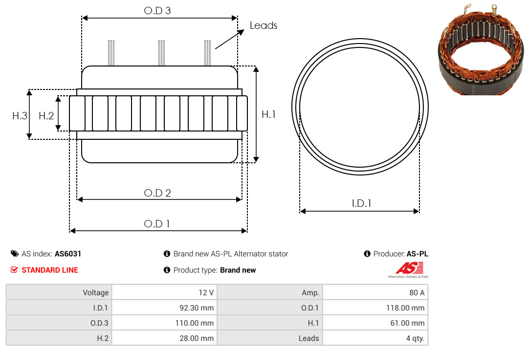 AS-PL Stator, Generator Universal 12V 80A AS6031