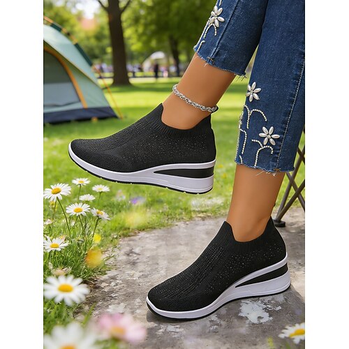 sneakers slip-on flyknit con strass rosa da donna – scarpe con zeppa traspiranti e leggere per camminare, fare fitness e indossare ogni giorno in modo casual