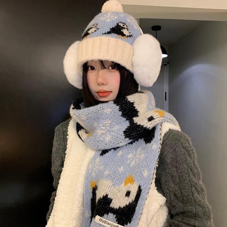 Cute Little Penguin with Cashmere Knitted Hat for Women Winter Warm and Cold Proof Ear Protection Woolen Hat Thickened Neck Scarf