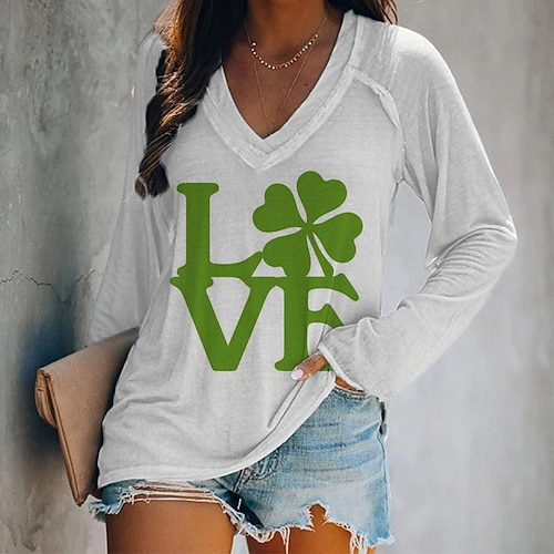 Maglietta da donna per il giorno di San Patrizio scollo a V a manica lunga grafica casual moda quadrifoglio top regolari stampa giorno di San Patrizio verde erba bianco verde chiaro verde scuro verde