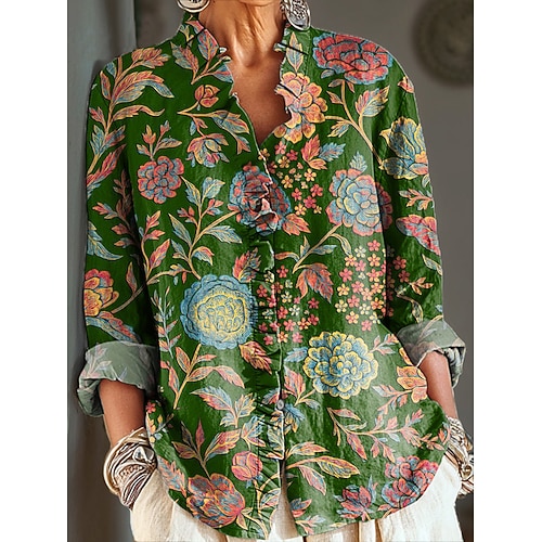 Per donna Camicia Boho Floreale Grafico Elegante Vintage Quotidiano Manica Lunga Scollo a V Top Regolari Lavoro Quotidiano Ferie Arricciato Volant Rosa Rosso Blu Blu turchese Verde Primavera Autunno