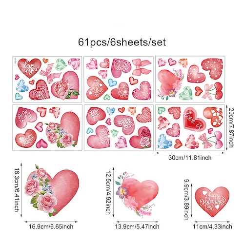 6 fogli di adesivi per finestre a forma di cuore per San Valentino, per feste, matrimoni, adesivi murali romantici per la casa, decalcomanie in PVC