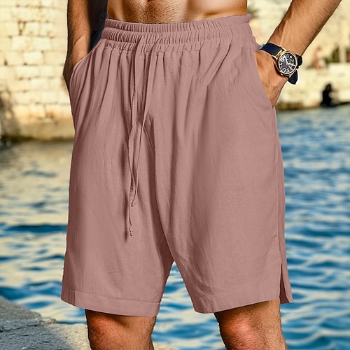 Per uomo Pantaloncini Pantaloncini di lino Pantaloncini estivi Pantaloncini da spiaggia Tasche A cordoncino Vita elastica Liscio Traspirante Lunghezza del ginocchio Esterno Per eventi Spiaggia