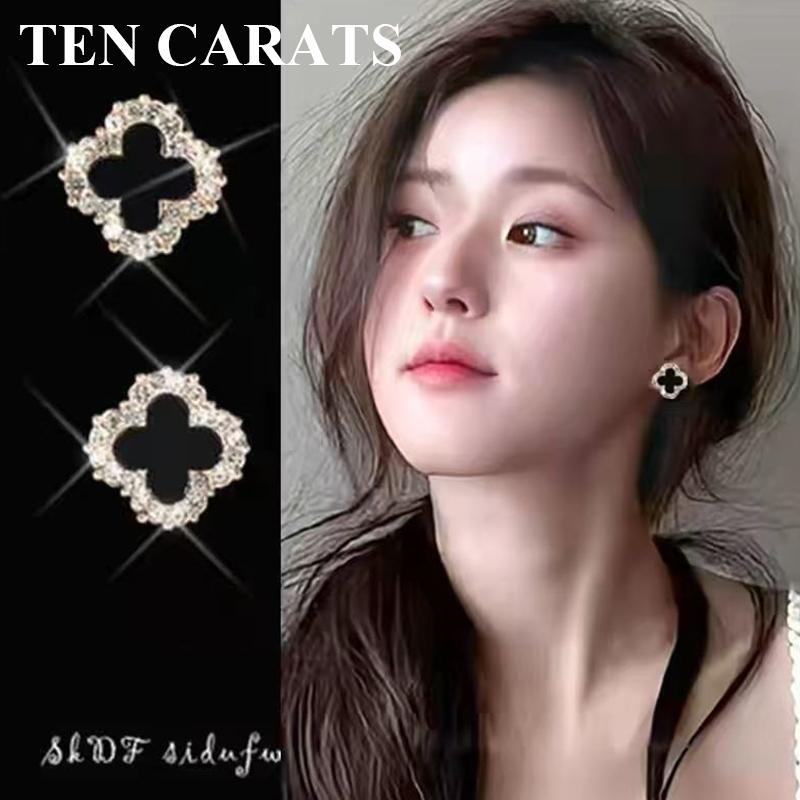 TEN CARATS Golden Classic 925 Silver Stud Earrings Clover Black Onyx Crystal Women Luxury Jewelry Gift for Daily Wear golden
