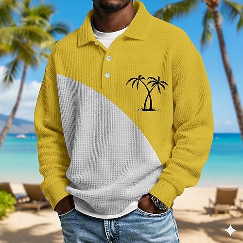 Per uomo Palma Magliette Polo a Nido d'Ape Manica Lunga Magliette polo Bavero Hawaiano Athleisure Abbigliamento quotidiano Abbigliamento da vacanza Stampa 3D Primavera Autunno Inverno Blu Giallo Viola