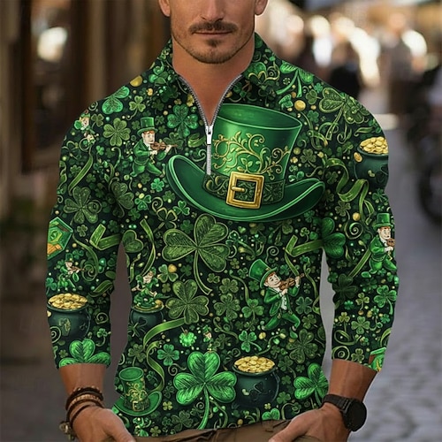 Per uomo Polo Polo con zip Quotidiano San Patrizio Bavero Manica Lunga Moda Hawaiano Grafico Quadrifoglio Stampa Zip a un quarto Primavera Autunno Vestibilità regolare Verde foresta Verde prato Verde
