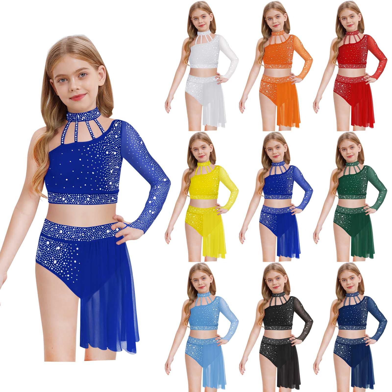 Barn Flickor Samtida Lyrisk Dansdräkt - En Axel Genomskinlig Mesh Långärmad Strass Crop Top & Oregelbunden Kjol cm svart