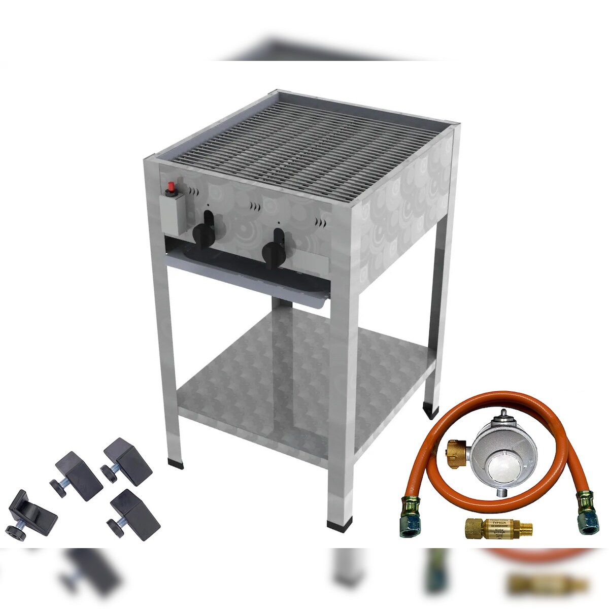 ChattenGlut ChattenTec Professional doppelwandiger Gastrobräter 2-flammig Standgerät 8 kW, Flüssiggas 485x530x830 mm mit Gewerberegler und Rost