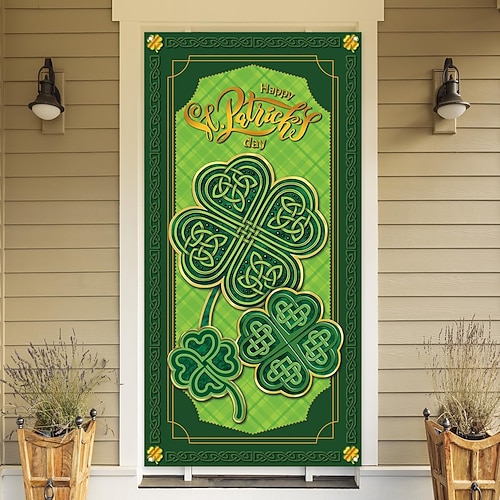 striscione per porta di San Patrizio, motivo con trifogli e nodi celtici, messaggio buon giorno di San Patrizio, decorazione festiva per l'ingresso per la celebrazione di San Patrizio.