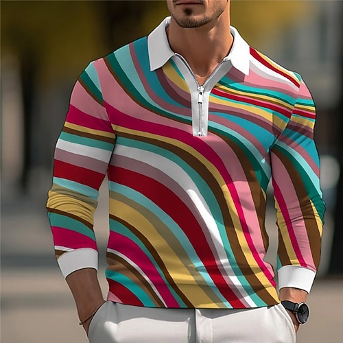 Per uomo Blocco di colori Geometrico Polo Manica Lunga Collo ripiegato Casual Sport Outdoor Athleisure Casual Quotidiano Cerniera Stampa 3D Primavera Autunno Inverno Arcobaleno