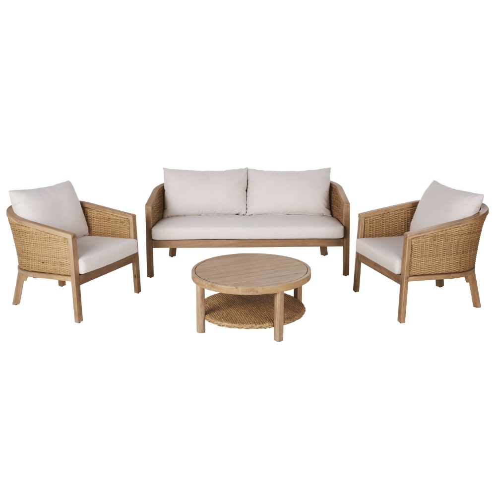 Salotto da giardino 4/5 posti in legno di acacia e cuscini écru