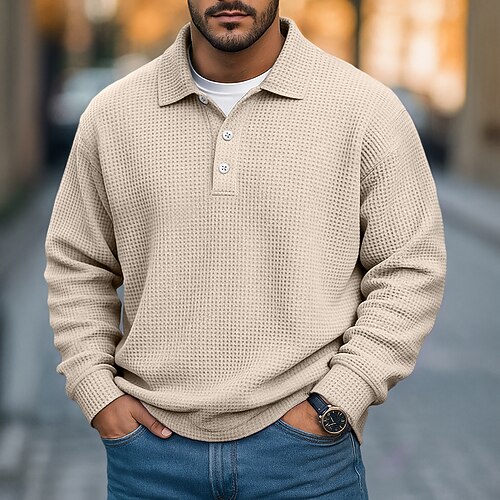 Per uomo Magliette Polo a Nido d'Ape Testurizzato Casuale Streetwear Colletto Polo a Coste Manica Lunga Moda Tinta unica Bottoni Puro Autunno Primavera Autunno Vestibilità comoda Viola Cachi Grigio