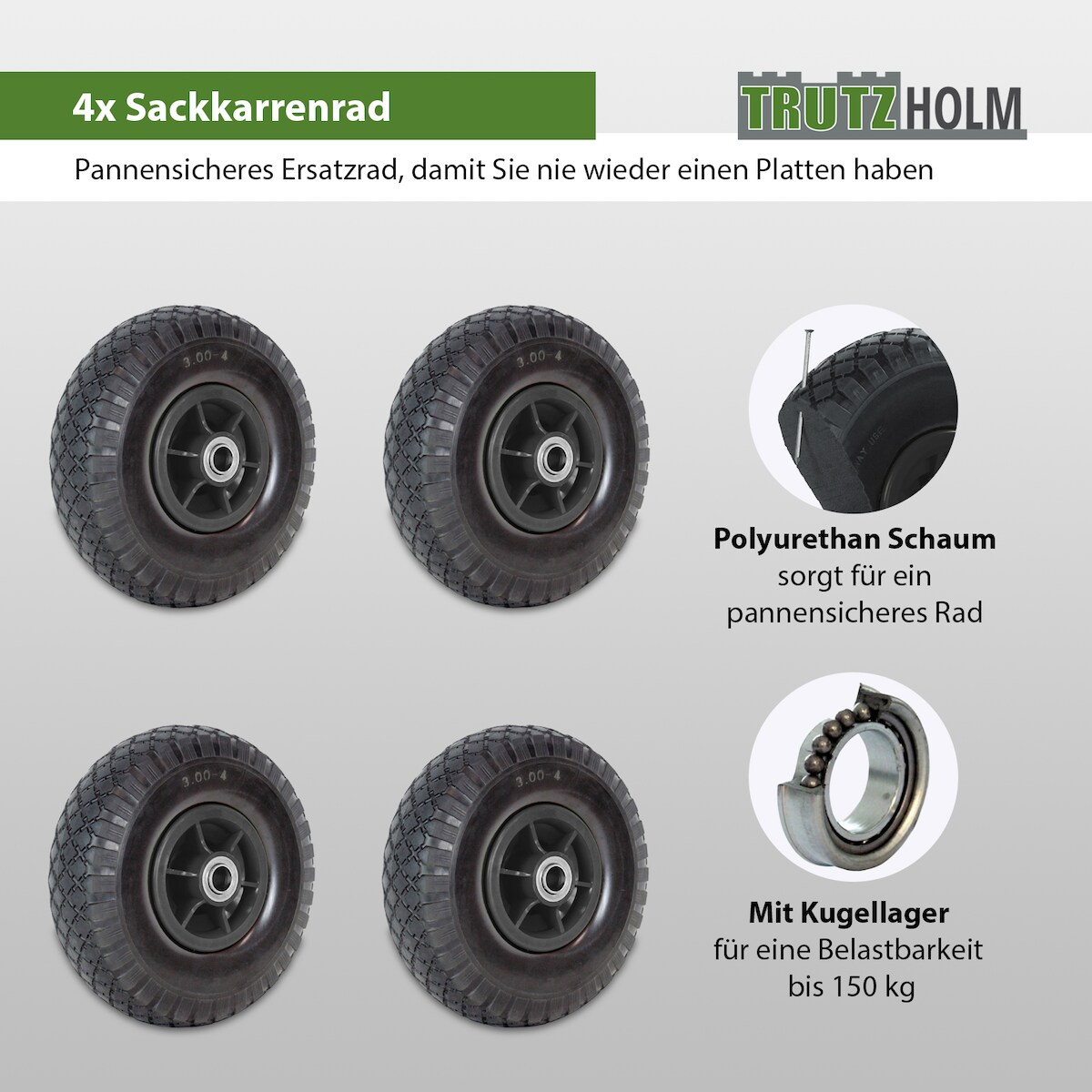 Baumarktplus 4x Sackkarrenrad PU-Rad 260x85 mm 3.00-4 60 mm versetze Nabe Ø 20 mm schwarz Vollgummi Bollerwagen