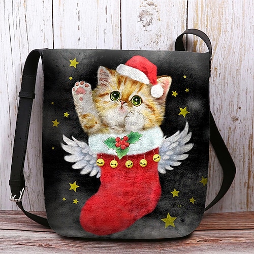 borsa tote natalizia da donna, con adorabili disegni di gatti di Kayomi Harai con testo ho ho ho, morbido tessuto floccato in poliestere, tracolla regolabile, ideale per lo shopping natalizio, regali e festività invernali