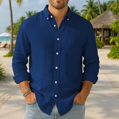 Per uomo Camicia in cotone e lino Colore Solido / Tinta Unita Vacanza Nero Bianco Rosa Blu marino scuro Manica Lunga Bavero Abbigliamento Bottonato