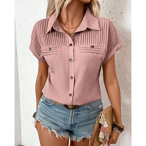 Per donna Camicia Blusa Semplice Elegante Manica Corta Colletto a Camicia Top Regolari Quotidiano Lavoro Ferie Arricciato Bottoni Verde chiaro Rosa Viola Arancione Verde Estate Primavera Autunno
