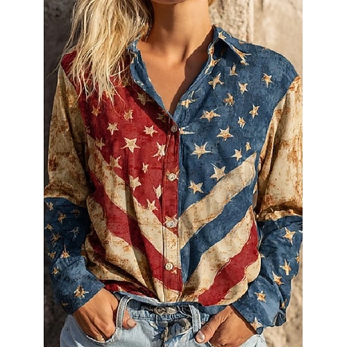 Maglietta da donna per il giorno dell'indipendenza, grafica, bandiera, astratta, vintage, elegante, da indossare tutti i giorni, a maniche lunghe, con colletto, da lavoro, da giorno, patchwork, con