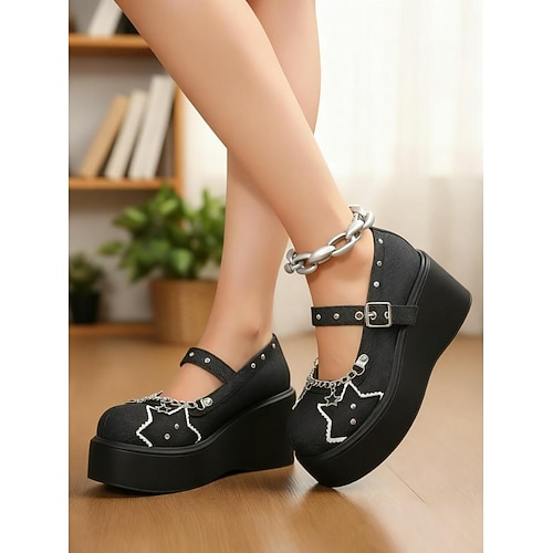 scarpe mary jane con plateau gotiche da donna: tacchi con plateau in denim nero con catene a stella e cinturini borchiati per feste di Halloween e look streetwear