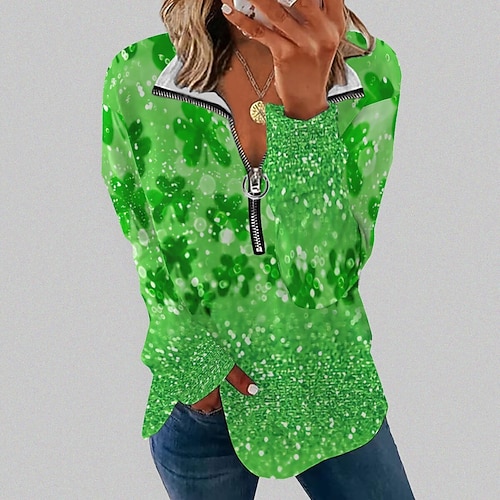 Giorno di San Patrizio Festa di San Patrizio Per donna Maglietta Foglia Giorno di San Patrizio Essenziale Manica Lunga Scollo a V Top Regolari Casuale Ferie Stampato Zip a un quarto Verde primavera