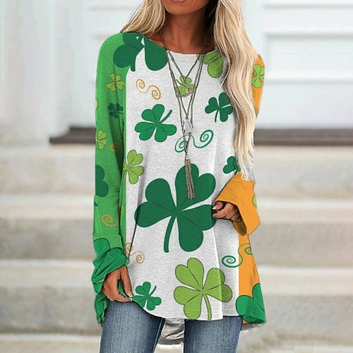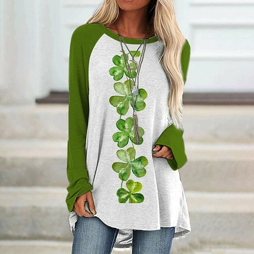 Giorno di San Patrizio Festa di San Patrizio Per donna Maglietta Foglia Giorno di San Patrizio Essenziale Manica Lunga Girocollo Top lunghi Ferie Weekend Stampato Verde primavera Bianco Verde
