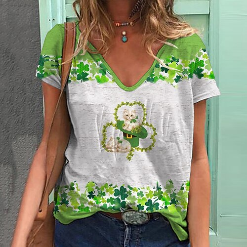 Giorno di San Patrizio Festa di San Patrizio Per donna Maglietta Foglia Giorno di San Patrizio Manica Corta Scollo a V Top Regolari Ferie Weekend Stampato Verde primavera Bianco Avorio Verde chiaro