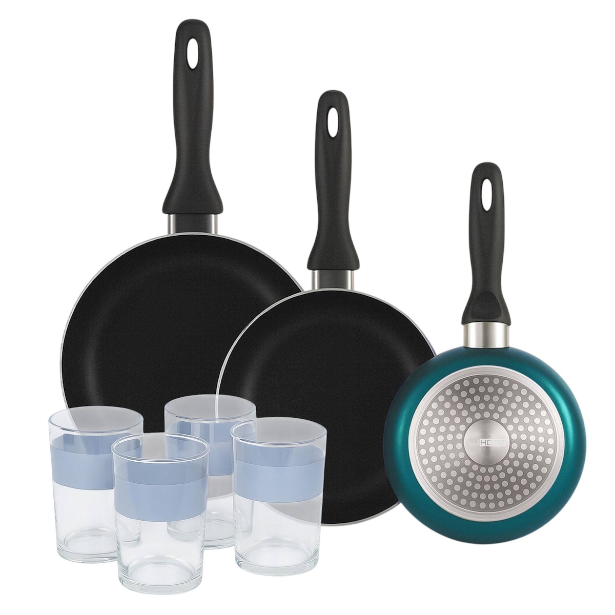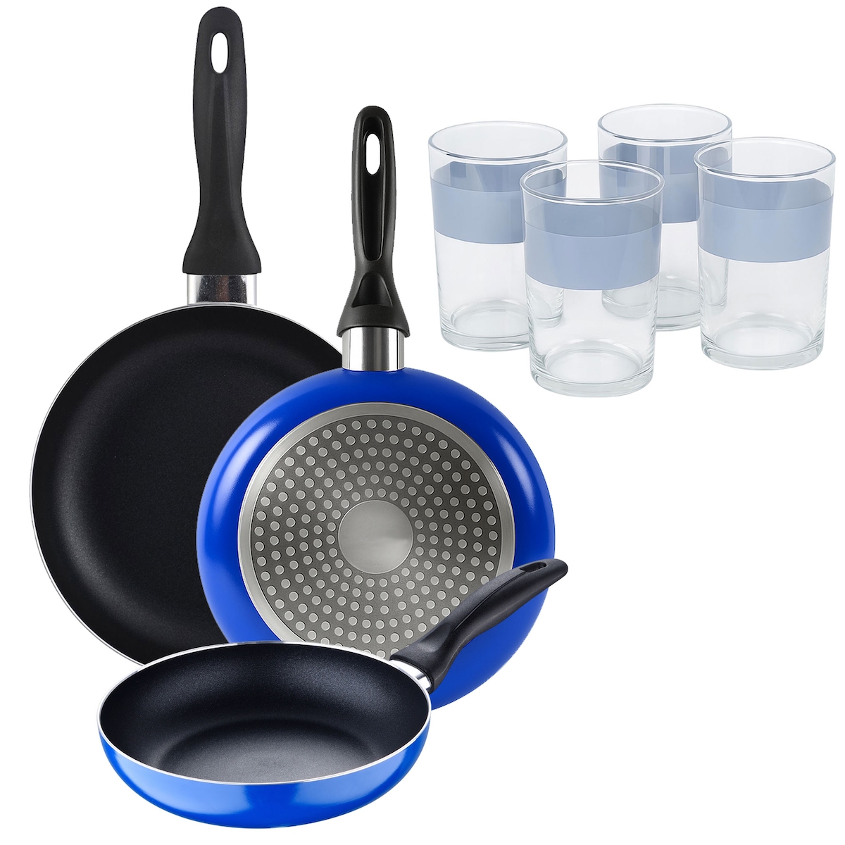 BERGNER - Set aus 3 Pfannen Ø16/20/24cm aus gepresstem Aluminium in metallic-blau mit 4er-Set Gläser 0,5 L NOIA