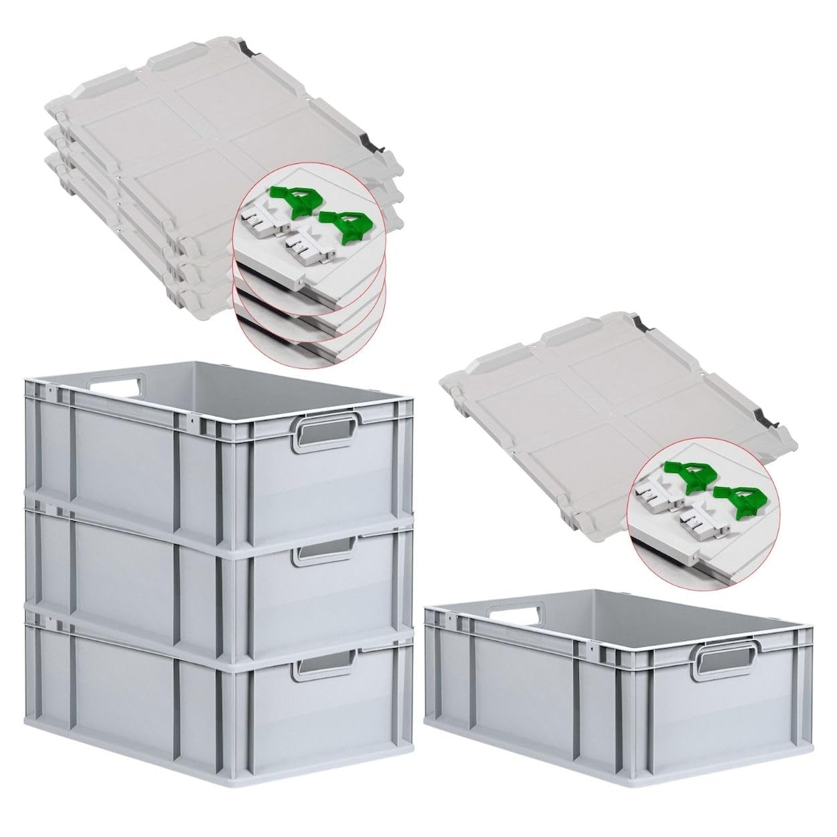 PROREGAL SuperSparSet 4x Eurobox NextGen Economy mit Scharnierdeckel & grünen Verschlüssen, Griffe offen, HxBxT 22x40x60cm, 44L, Eurobehälter, Box