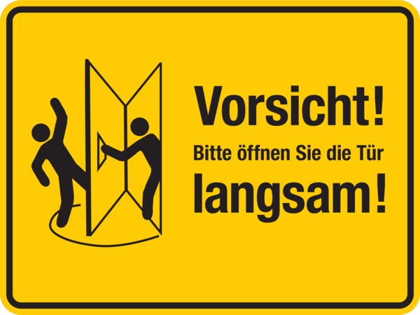 Türschild, Bitte öffnen Sie die Tür langsam!, rechts, gelb, 150 x 200 mm - 200x150 mm Folie selbstklebend