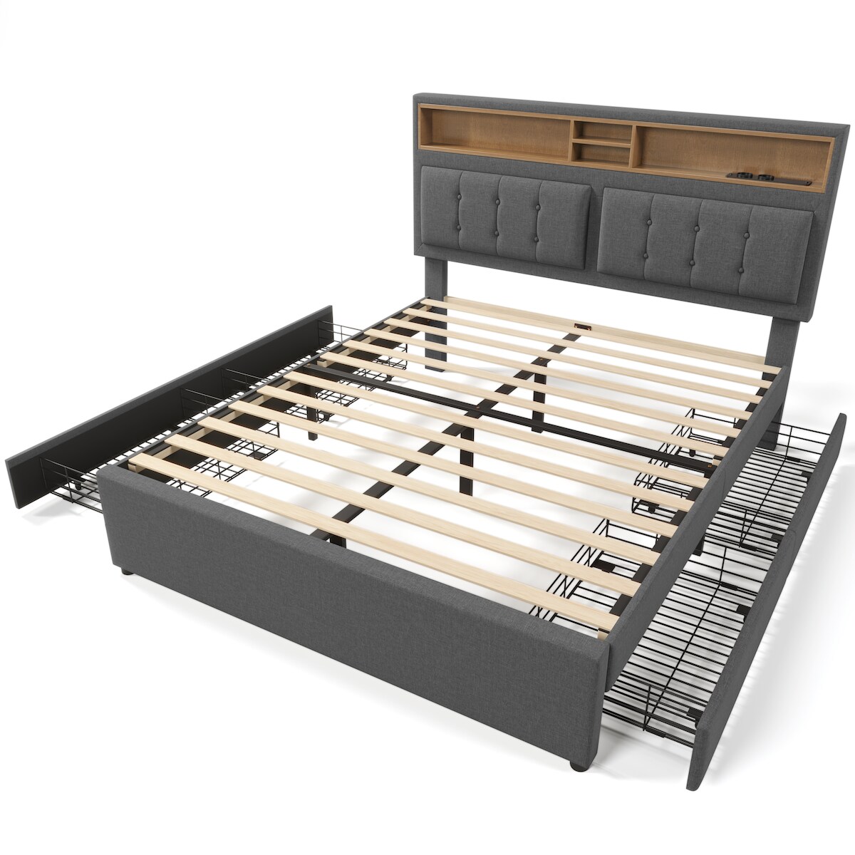 Merax Doppelbett mit 4 Schubladen& USB C Steckdose, Polsterbett 160x200cm, Höhenverstellbarem Kopfteil, Lattenrost aus Holz(Ohne Matratze) , Grau