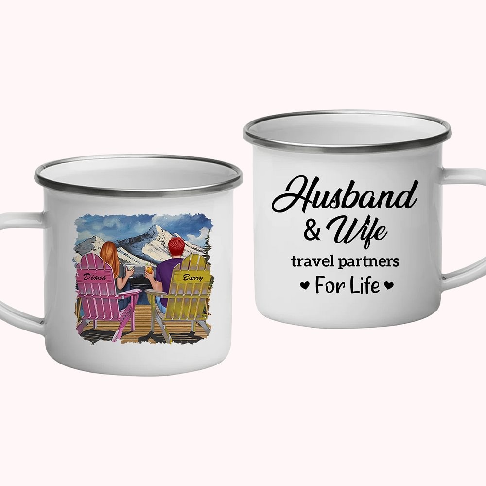 Taza esmaltada personalizada de la montaña del compañero de viaje del marido y de la esposa para el cumpleaños del aniversario de la pareja de la vida