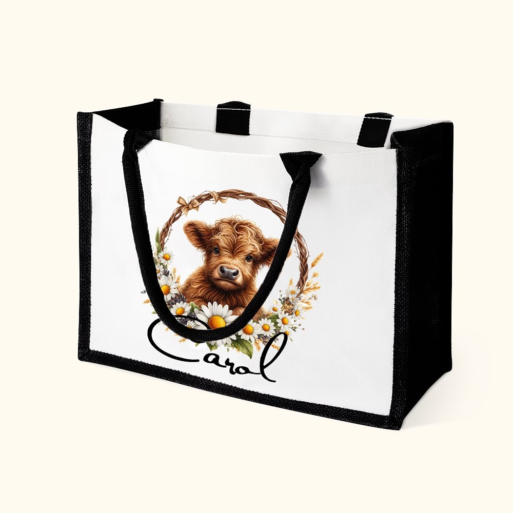 Personalizzato Highland Cow Sunflower Design Large Reusable Canvas Tote Bag con nome Travel Essentials Birthday Gift per gli amanti delle mucche