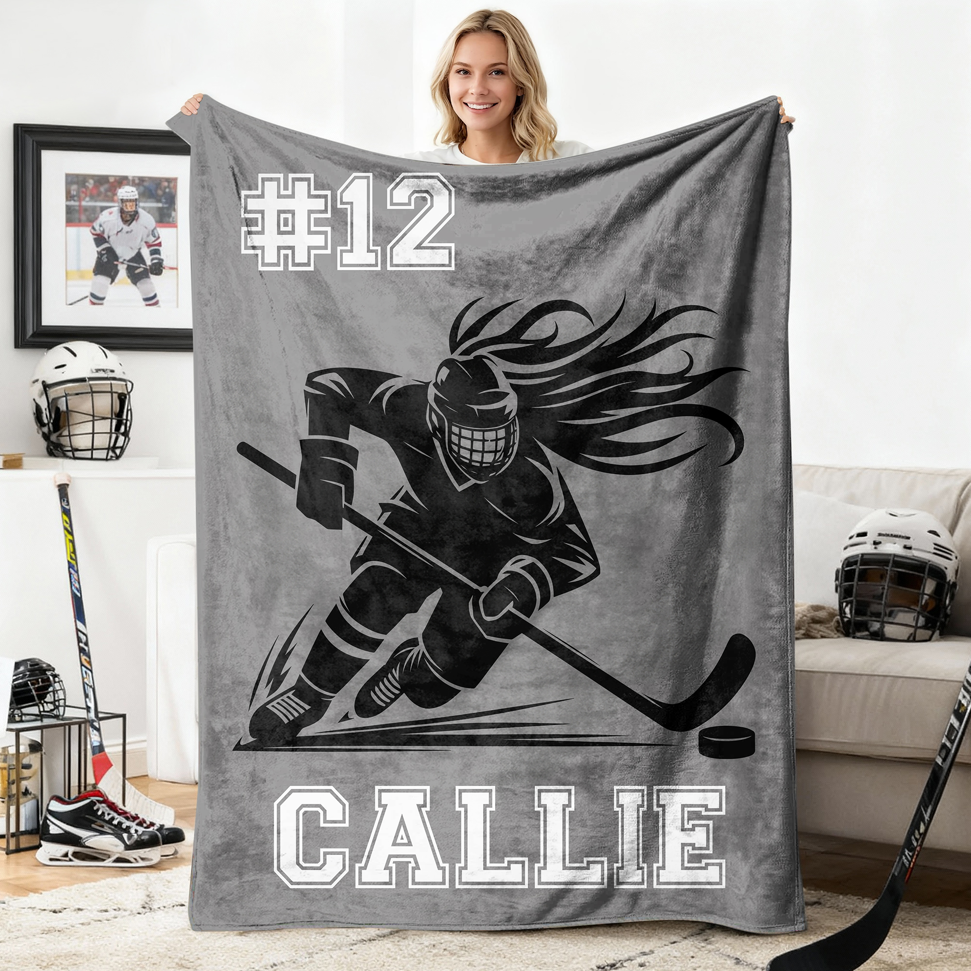 Personalizzato Giocatore di Hockey Silhouette Coperta morbida con nome Home Decor Compleanno Regalo per il giorno della partita per gli amanti dei giochi di squadra Hockey