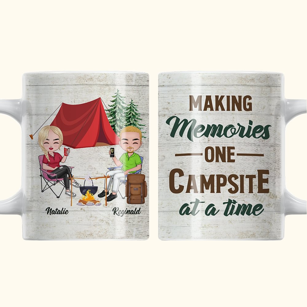 Tasse en céramique blanche personnalisée "Making Memories One Campsite At A Time" pour un couple, un ami ou un cadeau de camping.