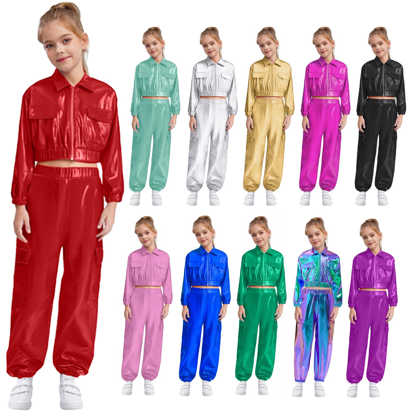Unisex Kids Hip Hop Dance Costume Metallic Jacket with Long Sleeve Turn Down Collar and Shiny Pants Set cm blue