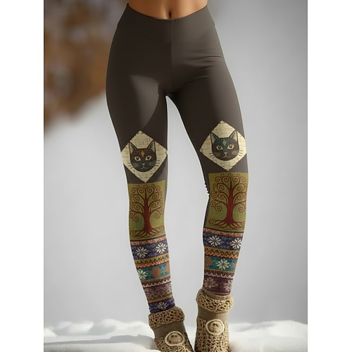 Per donna Leggings Leggings comodi Vacanza Vintage Stile Etnico Lunghezza intera Vita Alta Grafico Gatto Stampa Confortevole Alta elasticità Vacanza Casuale Quotidiano Verde scuro Verde foresta