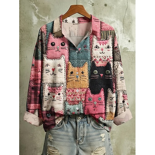 Per donna Camicia Blusa Grafico Animale Gatto Vintage Tropicale Elegante Manica Lunga Colletto a Camicia Top Regolari Quotidiano Patchwork Bottoni Stampato Rosa Blu Estate Primavera Autunno Inverno