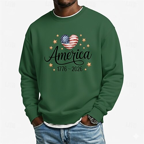 Felpa da uomo con grafica, bandiera americana, 250° anniversario, sportiva, moda, quotidiano, classica, girocollo, per attività all'aperto, vacanza, rosa, rosso, verde, grigio, stampa, primavera,