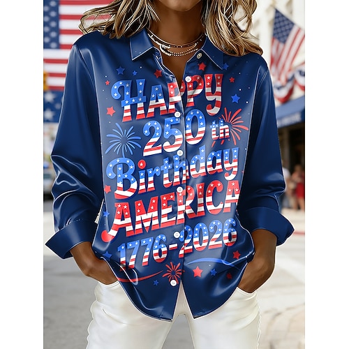 Giorno dell'Indipendenza Americana Per donna Camicia Grafico Bandiera Vintage Elegante Moderno Manica Lunga Colletto a Camicia Top Regolari Quotidiano Ferie Blu Bianco Estate Primavera