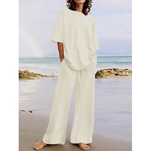 Completo da donna in cotone e lino, due pezzi, basic, tinta unita, con tasche, elastico in vita, maglietta, pantaloni, stile urbano, quotidiano, manica lunga, girocollo, nero, bianco, blu navy, marrone chiaro, blu, estate, primavera.