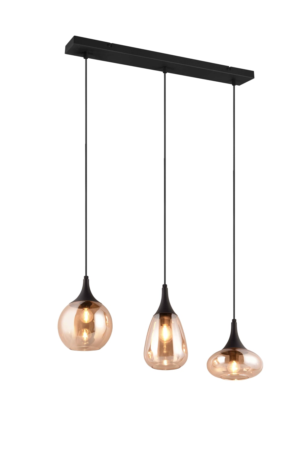 Lampada a sopensione 3 diffusori, metallo, nero e ambra, L 68 cm