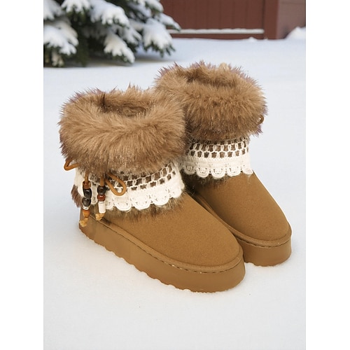 stivali da donna marroni con fodera in pelliccia sintetica e dettagli all'uncinetto: calzature invernali casual con dettagli di perline e morbida fodera in peluche, ideali per Natale, regali per le feste e gite invernali informali