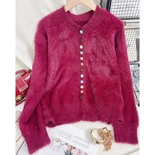 Per donna Felpa Cardigan Pom Pom regalo di Natale Vintage Tinta unica A Coste Girocollo Bottoni Lavorato a maglia Manica Lunga Top Regolari Maglia Natale All'aperto Uscire Rosso bordeaux Bianco