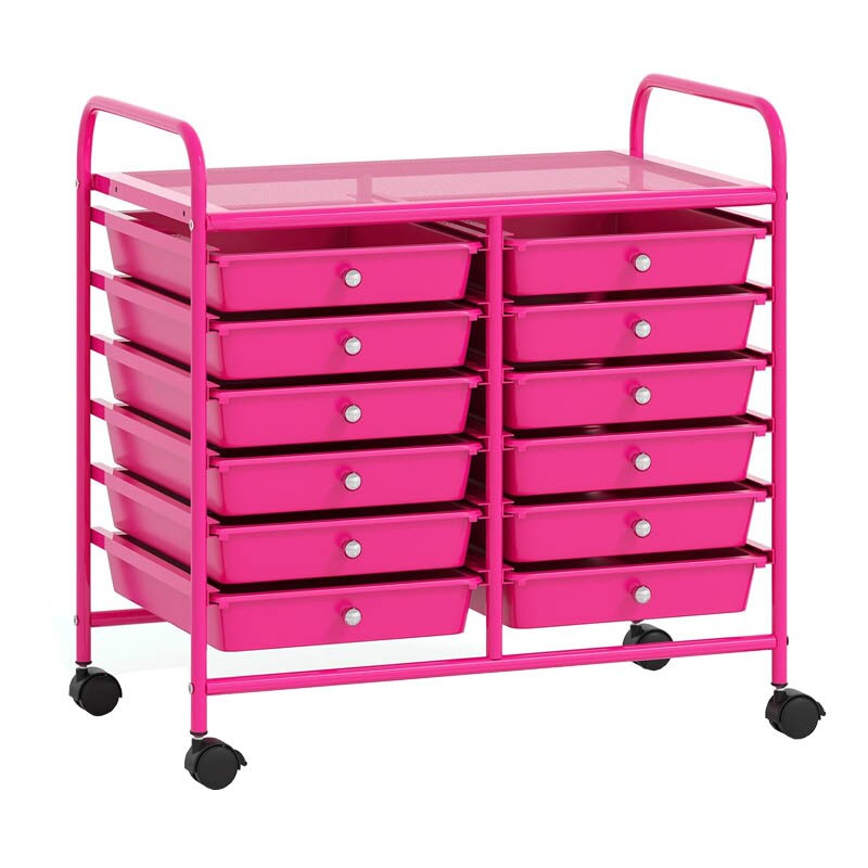 COSTWAY Rollwagen mit 12 stapelbaren Schubladen, Rollcontainer mit Metallrahmen und Ablage, 64 x 38 x 62 cm (Pink)
